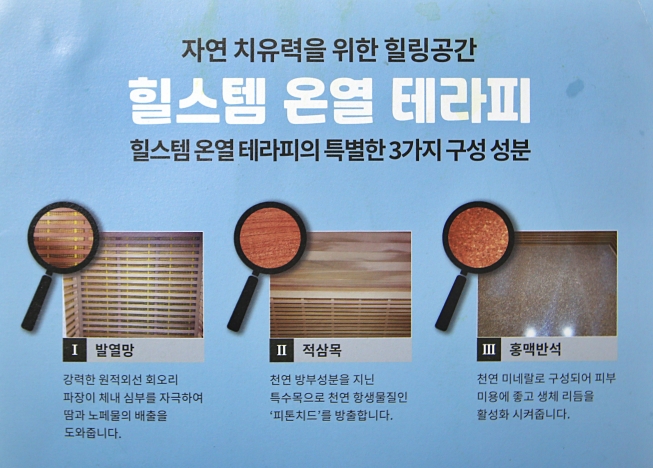 자연 치유력을 위한 힐링공간 발열망,적삼목,홍맥반석으로 구성"체온 1도만 올려도 몸 면역력이 올라갑니다" 남,여 구분 테라피운영